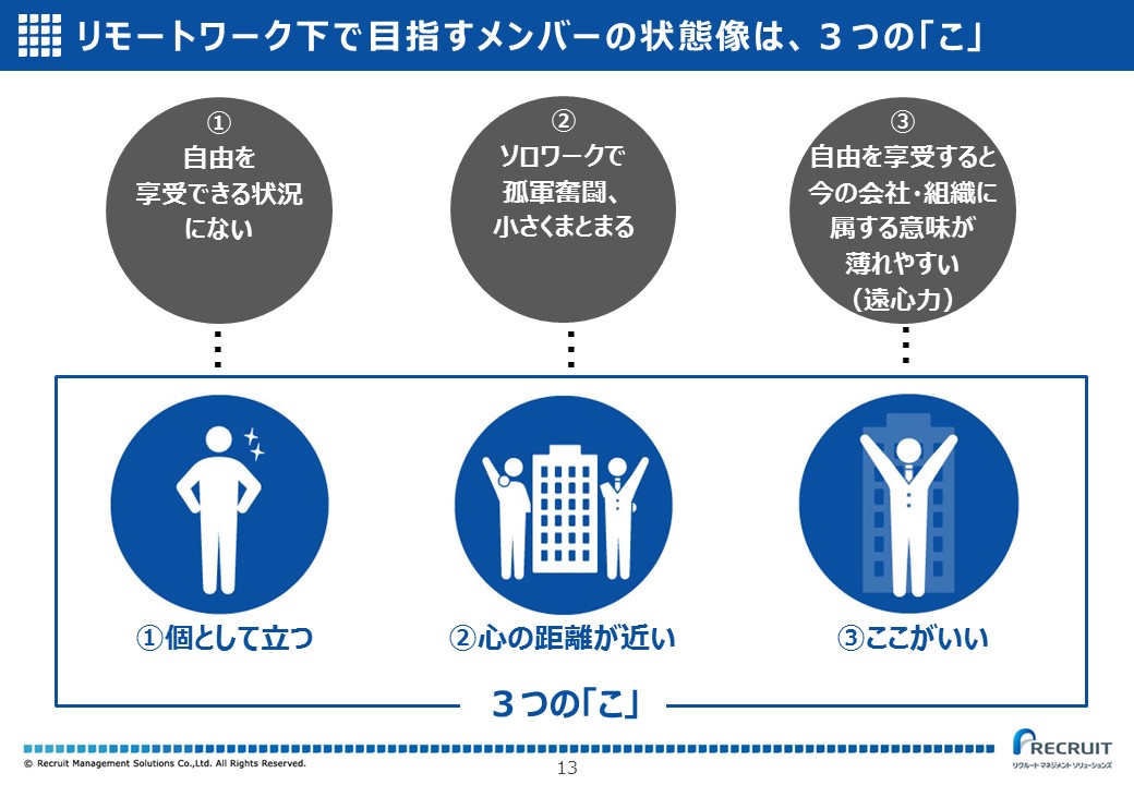 リモートワーク下で目指すメンバーの状態像は、3つの「こ」