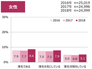 ◆自身が「薄毛である」と答えた人のボリュームは男性約27%、女性約9%と男性が高いが、前年比で見ると女性は「薄毛である」と答えた人の割合が増加。