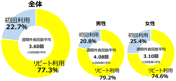 1カ月に1度以上外食(食事または飲酒)を行う人を対象にした調査で、1週間の外食回数は平均3.60回(0回を除く平均値)。うち、初回利用するお店は22.7%で、再利用(リピート)が77.3%であった。男女別では男性の方が平均外食回数が多く、同じ店に通う傾向が強かった。「リピート利用」する店を決める理由は「料理がおいしい」が69.6%と最多で、「コストパフォーマンス」が48.6%で続く。業態別では「牛丼、カレーなど、一品もの専売業態」で「リピート利用」が最も多く、95.1%を占めた。