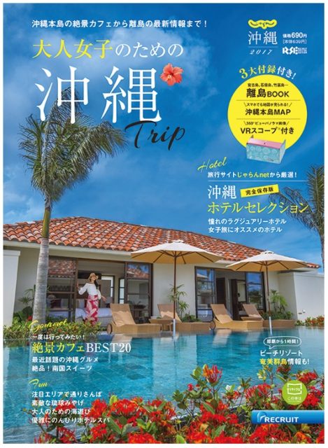 株式会社リクルートライフスタイル(本社:東京都千代田区、代表取締役社長:淺野 健)が編集を行う国内旅行情報誌『じゃらんムックシリーズ』(編集長:宮下 真衣子)は、30代~40代を中心とした大人女子をターゲットにした『じゃらん沖縄2017』を、沖縄の絶景や憧れのホテルが360°ビューが楽しめる「 VRスコープ® 」付きで、全国の書店・コンビニにて、2016年11月4日(金)より発売することをお知らせします。