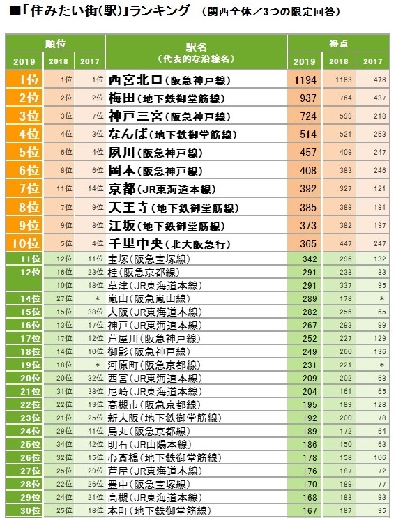 株式会社リクルート住まいカンパニー(本社:東京都港区 代表取締役社長:淺野 健)では、関西(大阪府・兵庫県・京都府・奈良県・滋賀県・和歌山県)に居住している人を対象に実施したWEBアンケート形式による「SUUMO住みたい街ランキング2019 関西版」を集計しましたので、概要をご報告いたします。