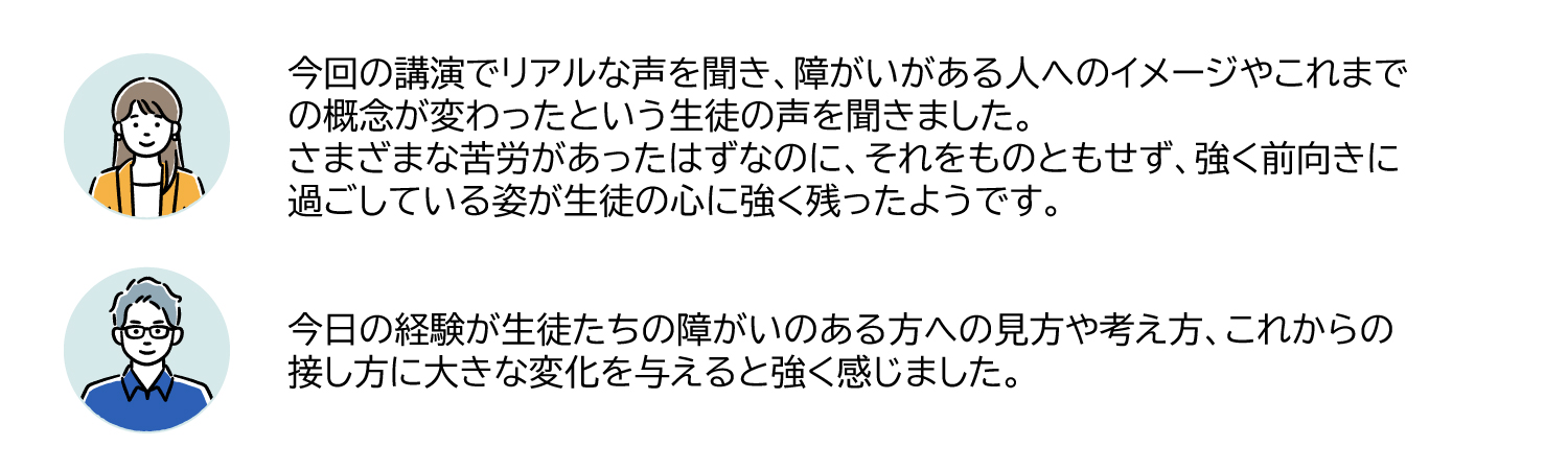今回の出張授業に参加いただいた生徒の皆さんと、先生方からの感想をご紹介します。